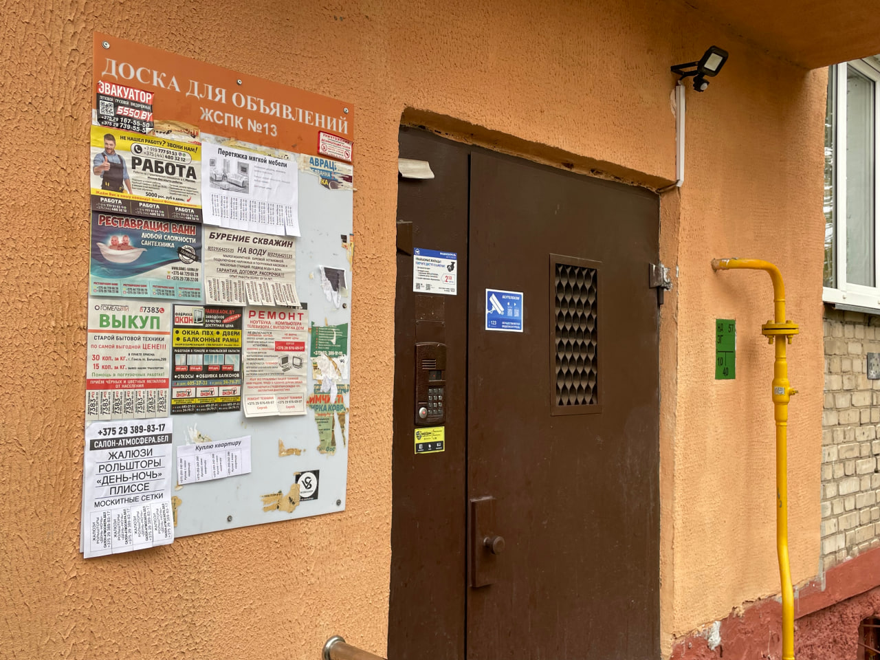 Улица Парижской Коммуны, дом 19. Обычный гомельский двор. Здесь идет своя молчаливая война. Работник ЖКХ, вздыхая, скребет лезвием объявление, размещенное на многострадальной двери подъезда.