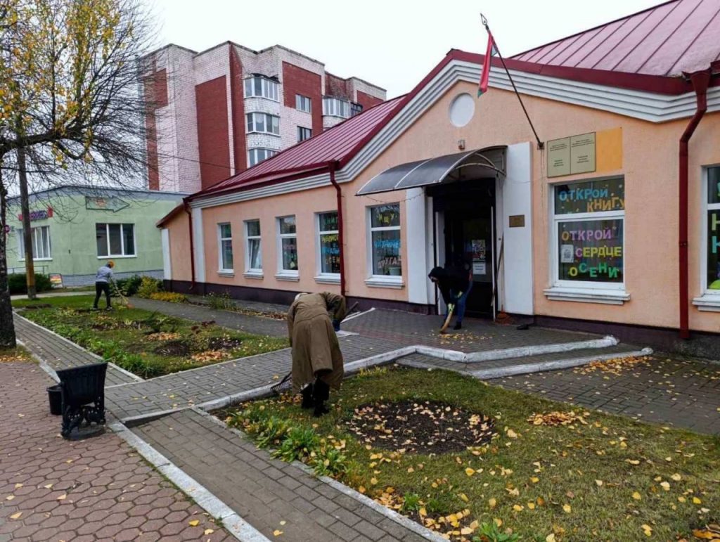 Работы велись одновременно снаружи и внутри. На прилегающей территории библиотекари провели масштабную уборку: собрали опавшую листву, очистили газоны от веток и мусора, тщательно подмели все дорожки, приведя площадь вокруг здания в идеальный порядок.