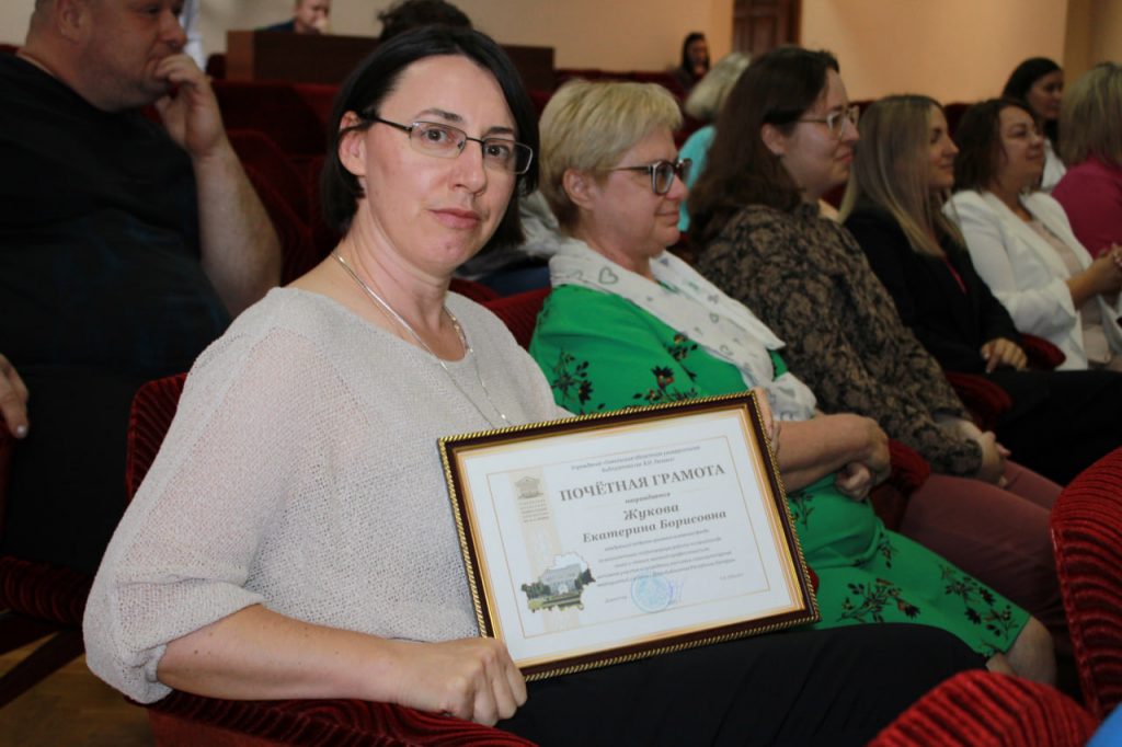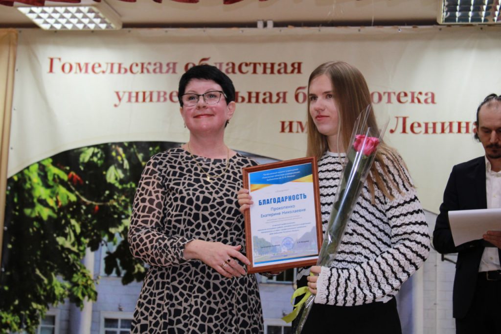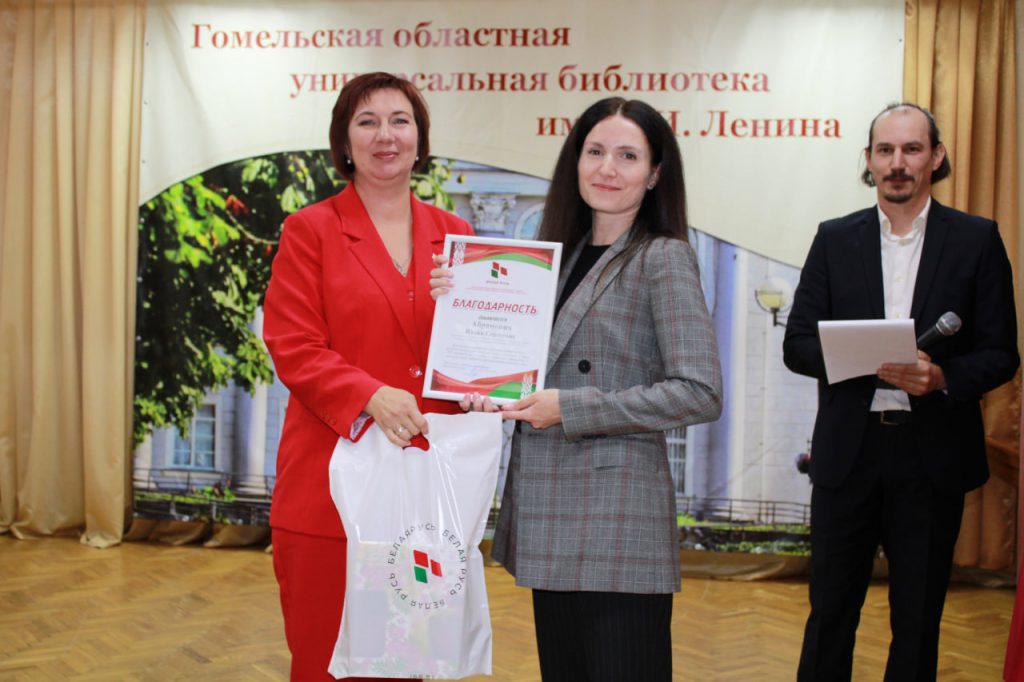 Торжественная часть началась с вручения ведомственных наград. Почетными грамотами Гомельской областной библиотеки были отмечены заместитель директора Денис Плешанков, заведующий отделом хранения основного фонда Екатерина Жукова и администратор баз данных отдела автоматизации Виталий Седько. Благодарности учреждения получили бухгалтер первой категории Светлана Глытова и вахтер административно-хозяйственного отдела Егор Хазеев.